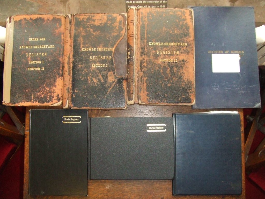 This website holds an online copy of the Knowle Parish Church Burial Register, a collection of several large volumes dating prior to 1900, and, over a century later, still being updated with new interments. These tomes variously list interments by Date, by Surname and by Plot Number; this duplication is an inherent source of human error. Any errors that have been found have been annotated in the Notes field of the Data Table.